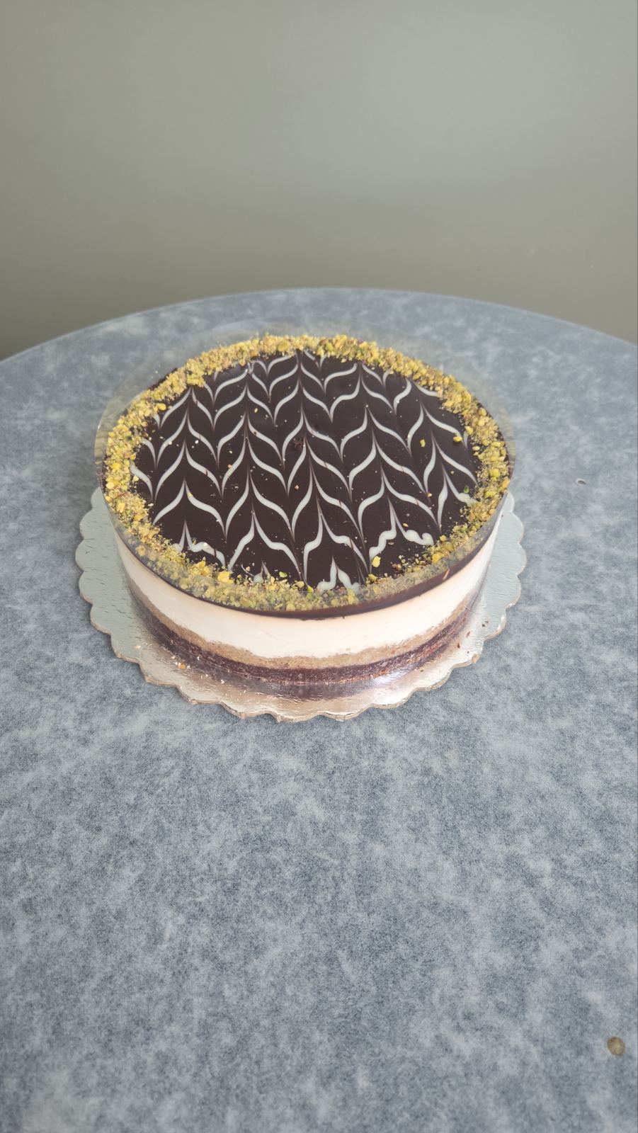 Дубайският чийзкейк съдържа: - Крема сирене - Паста шам фъстък - Черен шоколад - Какаови бисквити